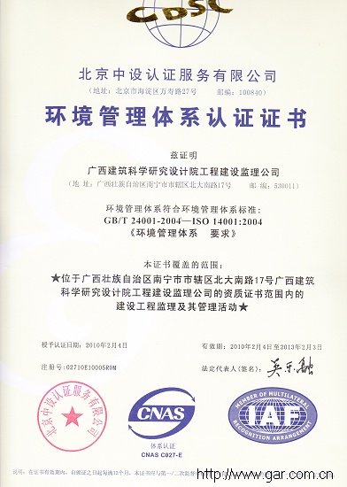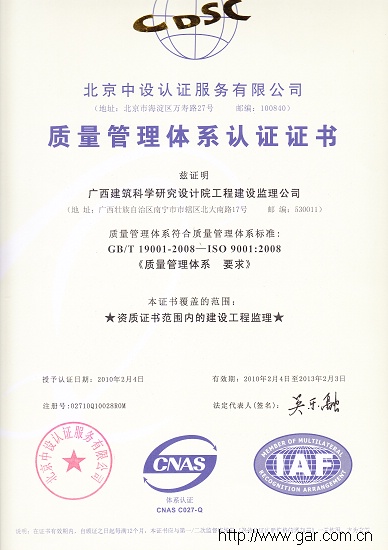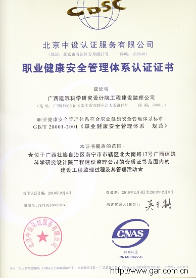 廣西建筑科學(xué)研究設(shè)計(jì)院工程建設(shè)監(jiān)理公司,于2010年1月16日通過(guò)了北京中設(shè)認(rèn)證服務(wù)有限公司對(duì)我公司:“質(zhì)量、環(huán)境、職業(yè)健康安全管理三位一體的管理體系認(rèn)證。2010年2月4日正式簽發(fā)授予:“GB/T19001-2008《質(zhì)量管理體系》”;“GB/T24001-2004《環(huán)境管理體系》”;“GB/T28001-2001《職業(yè)健康安全管理體系》”標(biāo)準(zhǔn)管理體系的認(rèn)證證書(shū)。