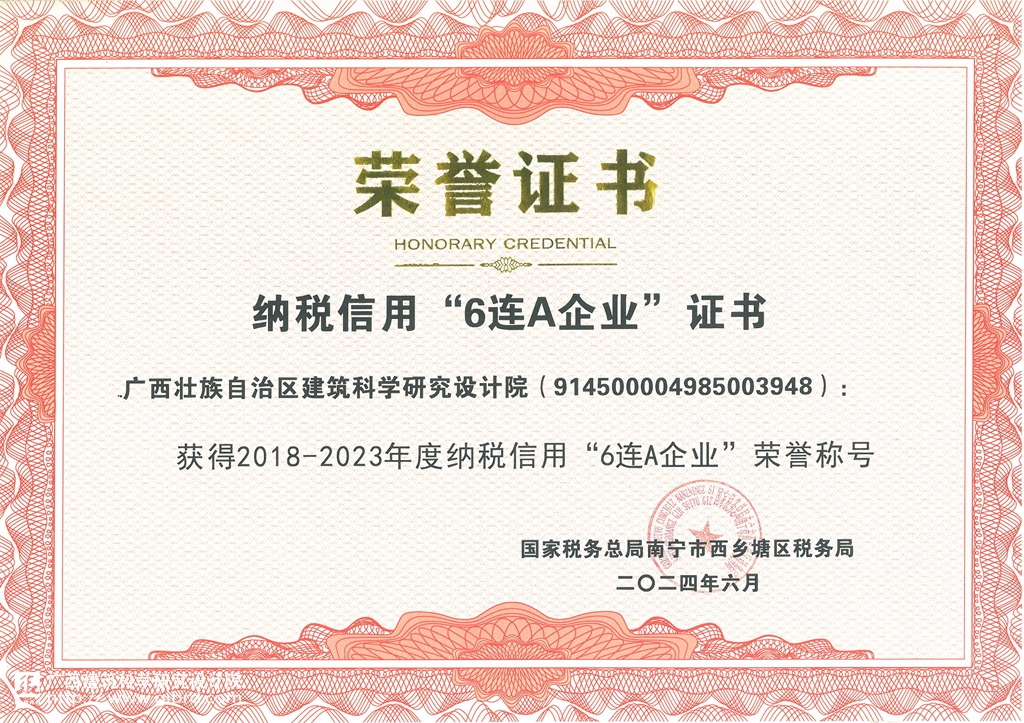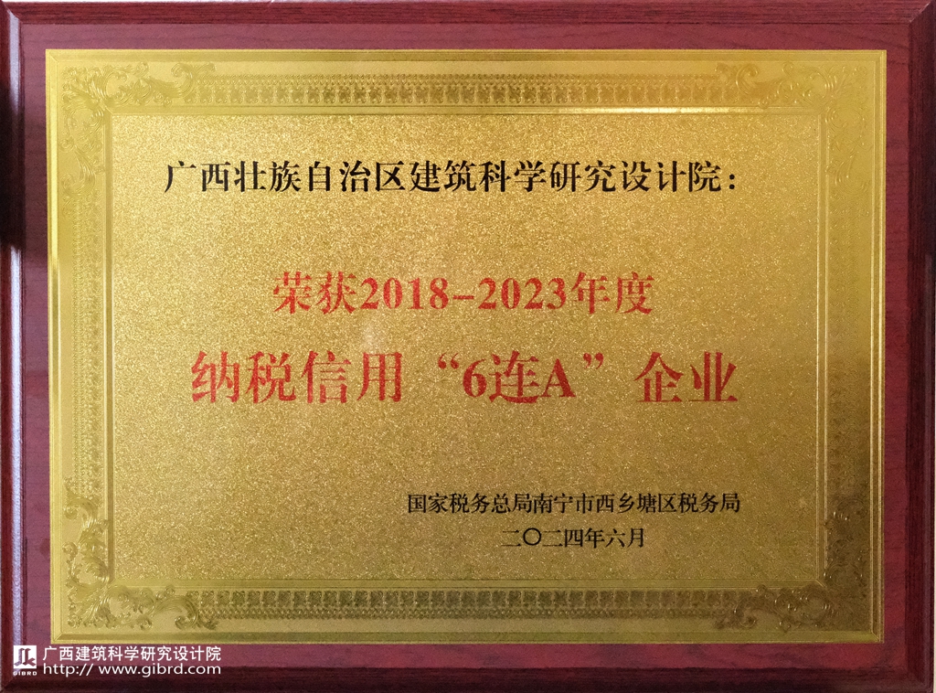 近日,南寧市稅務局授予我院“2018—2023年度納稅信用6連A企業”榮譽稱號。自2018年度首次獲得納稅信用A級企業以來,我院已連續六年獲此榮譽。