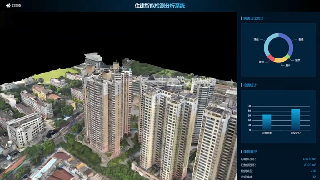 該系統集成建筑外圍護安全檢測與評估的全流程管理,主要系統功能包括:建筑外圍護圖像獲取及標準化預處理;利用先進的AI算法,自動識別和定位建筑外墻的各種病害(如裂縫、空鼓、滲水等);對建筑信息、檢測數據、評估結果等海量數據進行系統化管理,確保數據的完整性和可追溯性;通過圖表、三維模型等方式將數據可視化;提供標準化的接口,支持與無人機、傳感器等檢測設備的對接,以及與其他管理系統的數據交換。