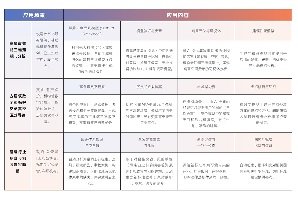 本模型旨在構建一個能夠深度理解和融合建筑行業各類數據的統一智能基礎模型,為建筑設計、施工、運維、管理乃至行業標準制定等全生命周期的建筑行業“大腦”。該模型的核心是其多模態處理能力,能夠同時理解和關聯來自不同來源和格式的數據,包括視覺數據:無人機航拍照片、地面拍攝圖像、紅外熱成像圖、衛星遙感圖像等;空間幾何數據:激光點云掃描數據、BIM(建筑信息模型)、CAD圖紙、傳統測繪數據、三維網格模型等;文本數據:建筑行業標準規范、法律法規、設計說明書、施工方案、竣工圖紙說明、技術報告、研究論文、招投標文檔、歷史文獻等;通過MBILM,能實現建筑信息的全面感知、深度認知和智能生成,賦能行業數字化轉型,提升效率、保障安全、促進創新,并助力文化遺產的保護與傳承。