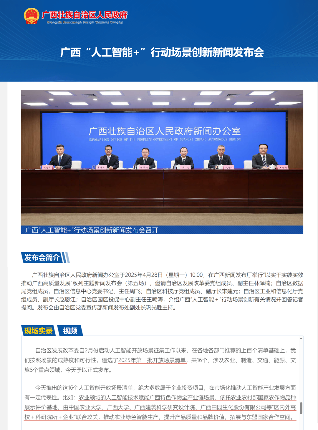 此次彭副市長一行的調研,正值我院深度參與研發的“人工智能技術賦能廣西特色作物全產業鏈”項目取得里程碑式進展——該項目憑借其卓越的創新性、深遠的應用前景及扎實的前期工作基礎,成功入選廣西壯族自治區人民政府新聞辦公室最新權威發布的2025年第一批“人工智能+”行動開放場景清單(全區共16個)。這一殊榮標志著該項目在人工智能與農業交叉領域技術創新的前瞻性和實踐價值獲得了自治區層面的高度認可。