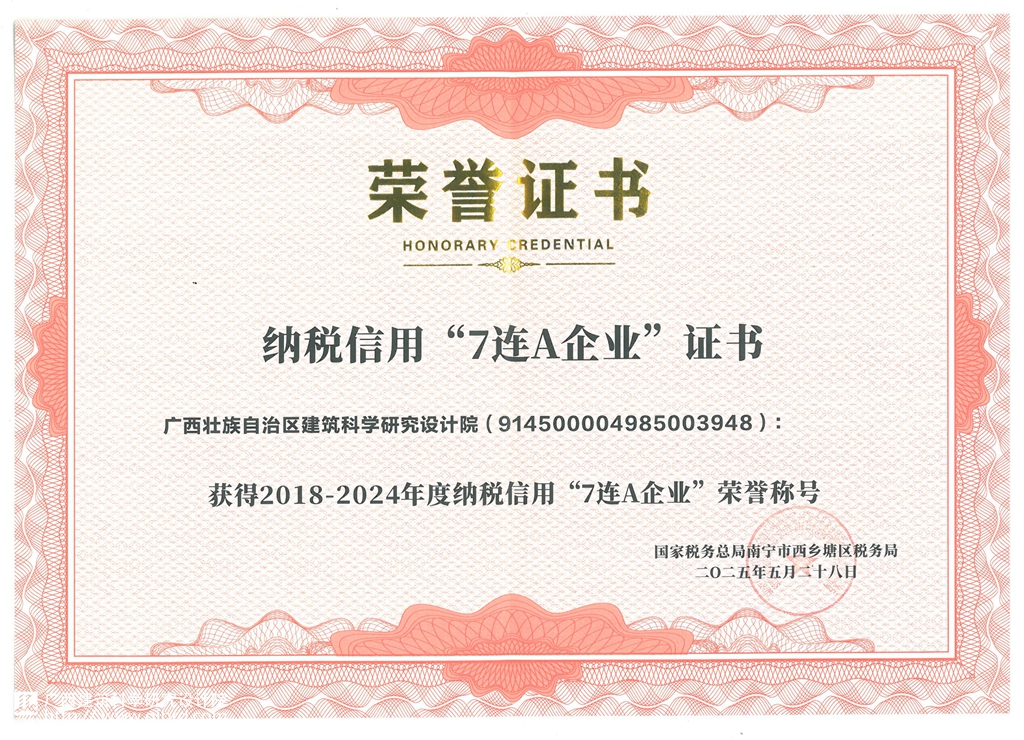 近日,國家稅務總局南寧市西鄉塘區稅務局公布了2024年度企業納稅信用等級評定結果。我院憑借長期以來誠信納稅的卓越表現和良好信譽,成功摘得2018至2024年度納稅信用“7連A”企業榮譽稱號。