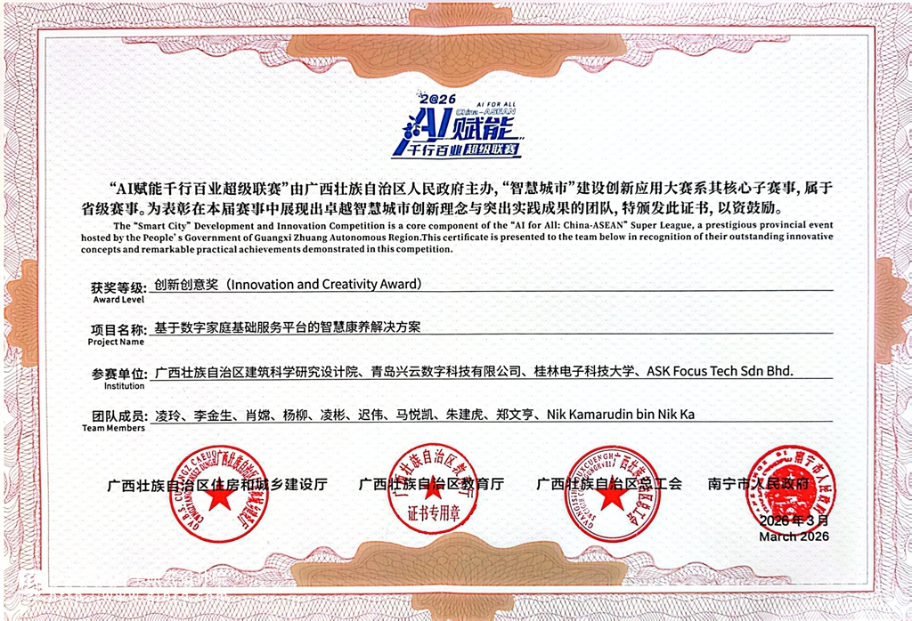 此次獲獎(jiǎng),是我院深耕智慧城市、AI 技術(shù)應(yīng)用領(lǐng)域的重要成果,彰顯了我院在產(chǎn)學(xué)研融合、服務(wù)地方發(fā)展方面的突出成效。未來,我院將以此次大賽為契機(jī),持續(xù)深化AI技術(shù)與智慧城市建設(shè)的融合創(chuàng)新,加強(qiáng)校企、校地合作,不斷推出更多高水平、實(shí)用性強(qiáng)的創(chuàng)新成果,為廣西智慧城市高質(zhì)量發(fā)展貢獻(xiàn)更多智慧與力量。