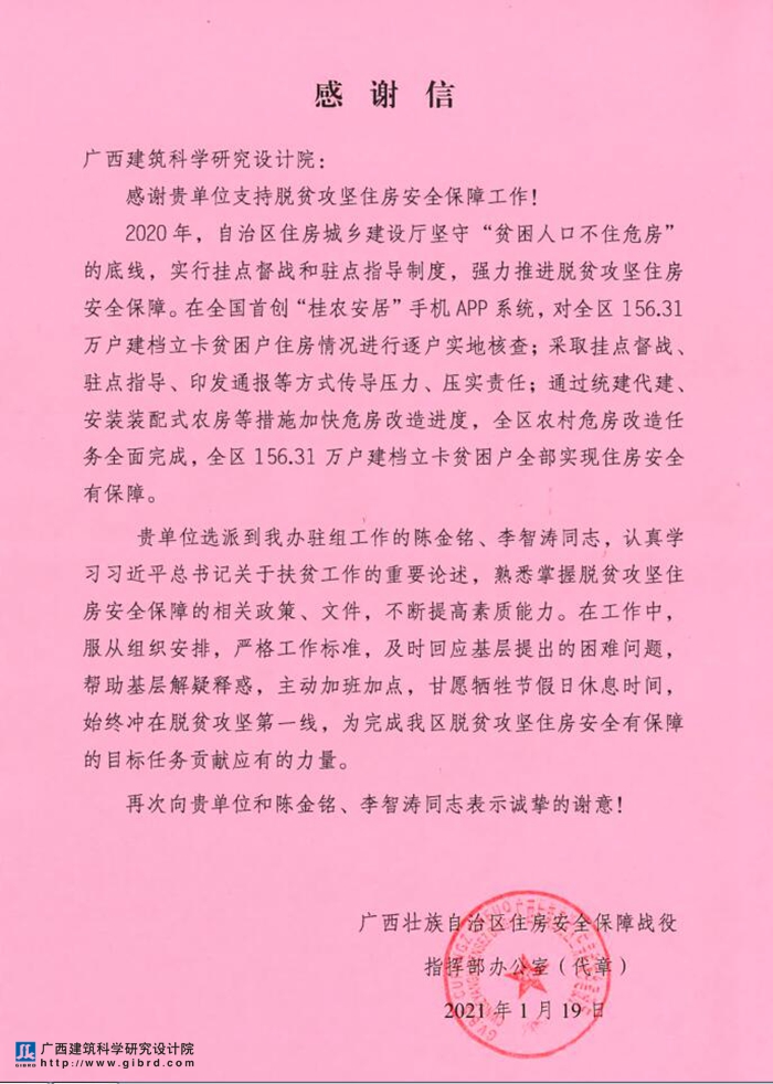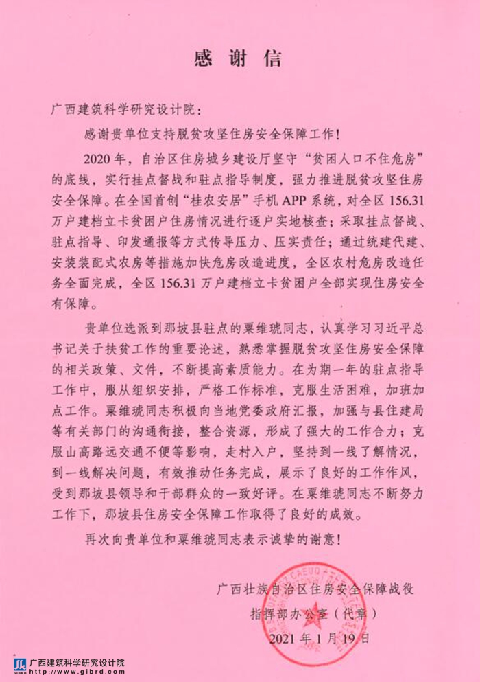 會上,劉哲處長介紹了到我院召開座談會目的,介紹了2020年全區(qū)鄉(xiāng)村風(fēng)貌提升工作取得良好的成效,得到了住建部和自治區(qū)領(lǐng)導(dǎo)的高度肯定,自治區(qū)政協(xié)主席孫大偉,自治區(qū)黨委常委、自治區(qū)副主席黃世勇,自治區(qū)副主席周紅波等領(lǐng)導(dǎo)先后蒞臨自治區(qū)鄉(xiāng)村風(fēng)貌提升三年行動指揮部調(diào)研指導(dǎo)。感謝我院積極主動大力配合和支持村鎮(zhèn)建設(shè)處開展脫貧攻堅住房安全有保障、鄉(xiāng)村風(fēng)貌提升等工作,同時送來了對我院及我院選派到廣西壯族自治區(qū)鄉(xiāng)村風(fēng)貌提升三年行動指揮部辦公室駐組工作的金逸鮮、陳勍、盧山雄等同志的感謝信。