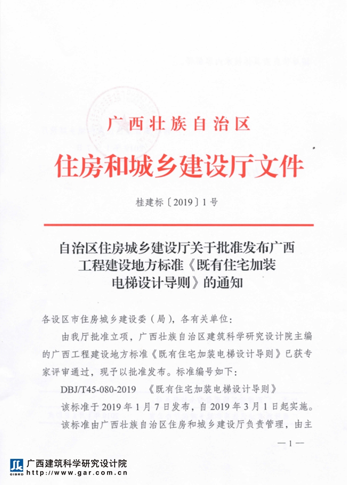 日前,由我院主編的《既有住宅加裝電梯設(shè)計(jì)導(dǎo)則》通過專家評審。2019年1月7日,自治區(qū)住建廳印發(fā)桂建標(biāo)〔2019〕1號文件,批準(zhǔn)發(fā)布。