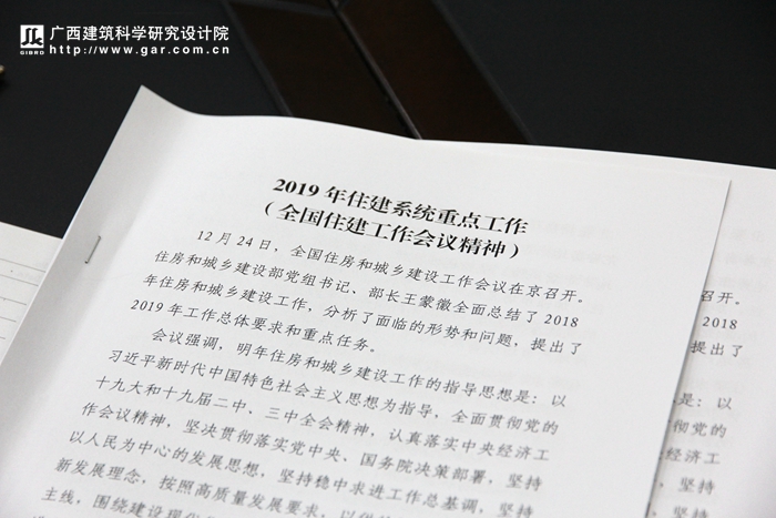 2018年12月24日,全國住房和城鄉建設工作會議在京召開。住房和城鄉建設部黨組書記、部長王蒙徽全面總結了2018年住房和城鄉建設工作,分析了面臨的形勢和問題,提出了2019年工作總體要求和重點任務。12月28日,我院班子成員集體學習了全國住建工作會議精神。