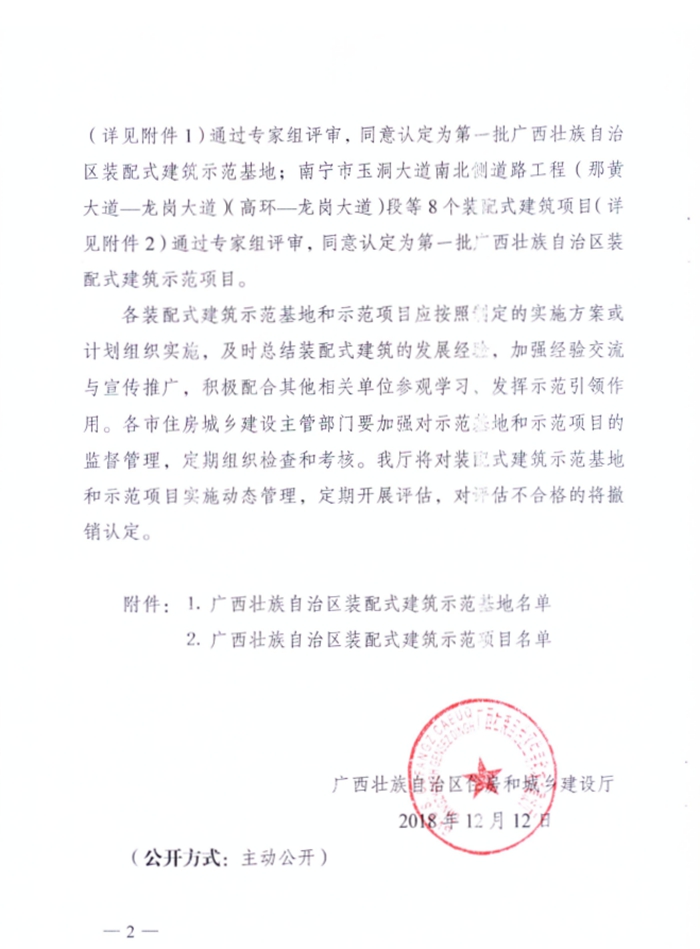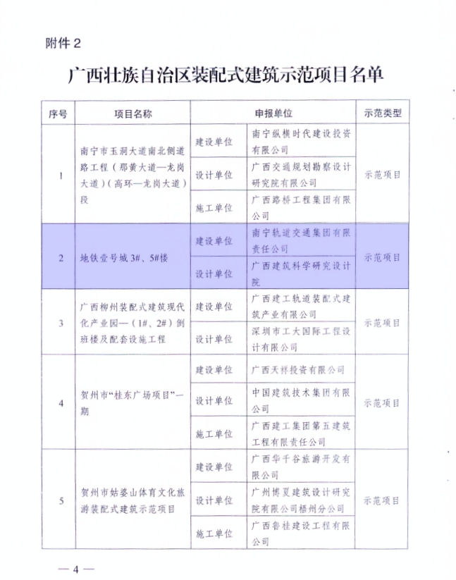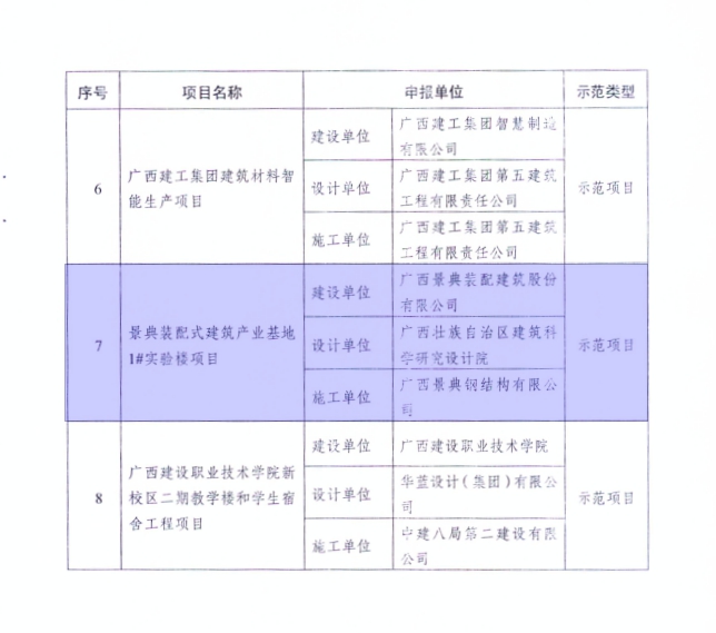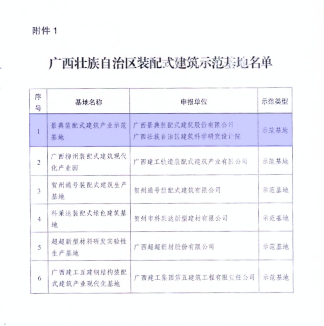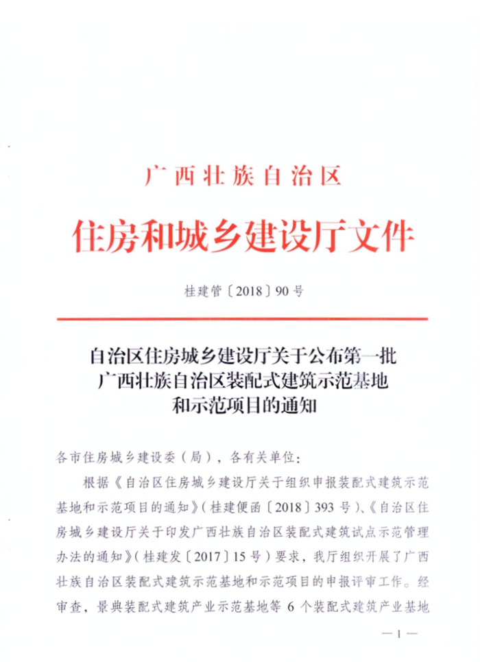 近日,自治區住房和城鄉建設廳印發桂建管〔2018〕90號文件公布第一批廣西壯族自治區裝配式建筑示范基地和示范項目,由我院申報的景典裝配式建筑產業示范基地被認定為我區裝配式建筑示范基地,由我院設計的地鐵壹號城3#、5#樓和景典裝配式建筑產業基地1#實驗樓被認定為我區裝配式建筑示范項目。
