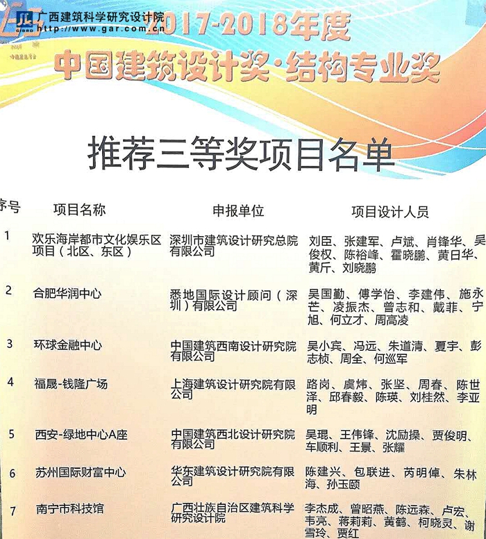 “南寧科技館結(jié)構(gòu)設(shè)計(jì)”、“合肥華潤(rùn)中心結(jié)構(gòu)設(shè)計(jì)”、“環(huán)球金融中心結(jié)構(gòu)設(shè)計(jì)”、“蘇州國(guó)際財(cái)富廣場(chǎng)結(jié)構(gòu)設(shè)計(jì)”等30個(gè)項(xiàng)目的結(jié)構(gòu)設(shè)計(jì)獲得了“中國(guó)建筑設(shè)計(jì)獎(jiǎng).結(jié)構(gòu)專業(yè)獎(jiǎng)”三等獎(jiǎng)。