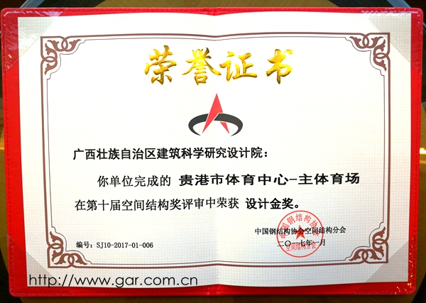 我院副總工程師李杰成代表我院和設(shè)計團隊參加了本次大會和頒獎儀式,領(lǐng)取了“中國空間結(jié)構(gòu)設(shè)計金獎”,沈世釗院士給我院李杰成副總工程師頒了獎。是我院首次獲得“中國空間結(jié)構(gòu)設(shè)計金獎”,也是廣西的設(shè)計單位首次獲得該獎,表明了我院在國內(nèi)空間結(jié)構(gòu)設(shè)計領(lǐng)域取得了優(yōu)異的成績。