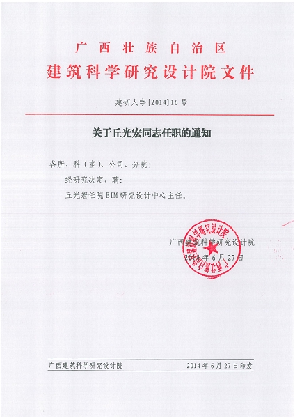 各所、科(室)、公司、分院: 經(jīng)研究決定,聘: 丘光宏任院BIM研究設(shè)計(jì)中心主任。