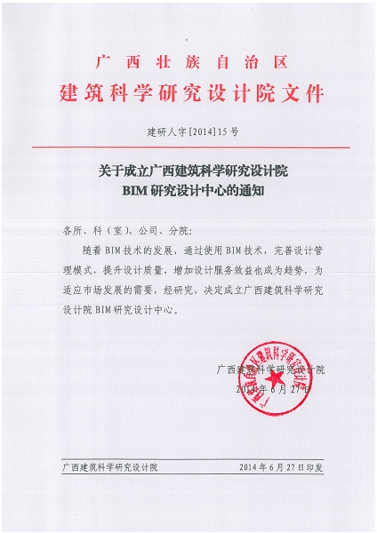 各所、科(室)、公司、分院: 隨著BIM技術的發展,通過使用BIM技術,完善設計管理模式,提升設計質量,增加設計服務效益也成為趨勢,為適應市場發展的需要,經研究,決定成立廣西建筑科學研究設計院BIM研究設計中心。