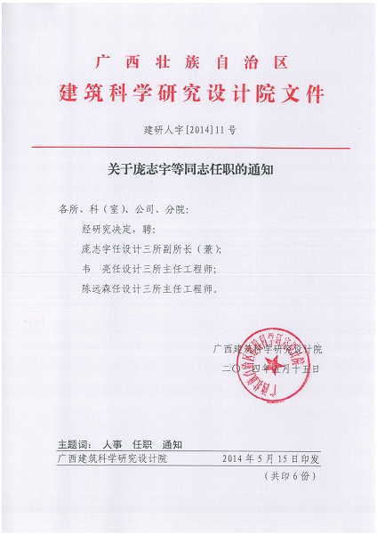 各所、科(室)、公司、分院: 經(jīng)研究決定,聘: 龐志宇任設(shè)計(jì)三所副所長(兼); 韋 亮任設(shè)計(jì)三所主任工程師; 陳遠(yuǎn)森任設(shè)計(jì)三所主任工程師。