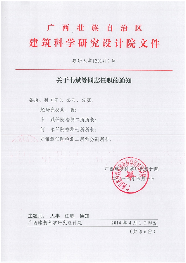 各所、科(室)、公司、分院: 經(jīng)研究決定,聘: 韋 斌任院檢測二所所長; 何 永任院檢測七所所長; 羅雄章任院檢測二所常務(wù)副所長。