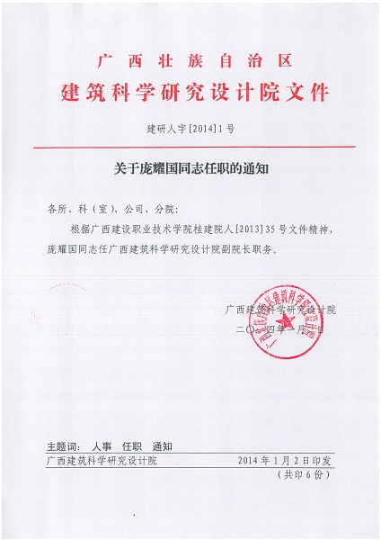 各所、科(室)、公司、分院: 根據廣西建設職業技術學院桂建院人[2013]35號文件精神,龐耀國同志任廣西建筑科學研究設計院副院長職務。