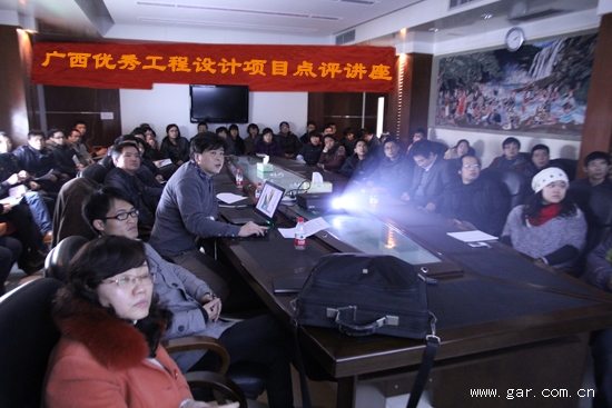 2013年1月14日下午,我院召開廣西優秀工程設計項目點評講座。顧濤副院長、潘文明總建筑師以及賴家憲副總建筑師到場進行點評講授,他們根據各工程項目的特點、特色以及設計理念進行了詳細分析和點評。我院各設計部門的主任工以及建筑專業的設計人員都到場聆聽。會場座無虛席,大家都被精彩的演講所吸引。