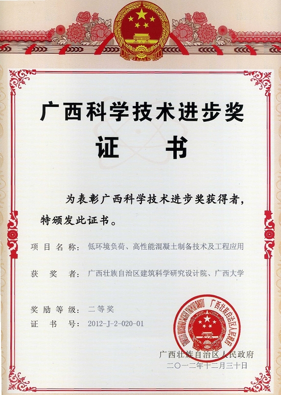 2013年1月9日,在廣西人民政府召開的2012年度廣西科技表彰獎勵大會上,我院科研成果“低環(huán)境負荷、高性能混凝土制備技術及工程應用”榮獲科技進步二等獎,“基于廣西氣候特征的居住建筑節(jié)能技術創(chuàng)新與集成示范”、“房屋建筑大跨度預應力混凝土梁板關鍵技術研究及應用”兩項目榮獲2012年度廣西科學技術進步三等獎。我院朱惠英副院長代表我院出席了大會。 同時廣西第22屆科技周活動在廣西展覽館舉行,全區(qū)各行業(yè)、各地市、各科研院所將自己在2012年度的科技成果展示出來。我院也參加了本次科技周活動,主要展示過去一年來我院在綠色建筑節(jié)能方面的科研成果和項目,特別是在綠色混凝土制備技術及工程應用的科研方面取得較突出的成績。 榮譽的取得既是鼓勵也是鞭策,我院將一如既往地按照既定的科研規(guī)劃,力爭在科技創(chuàng)新、綠色節(jié)能、提升支撐服務能力等方面取得更大的進步。
