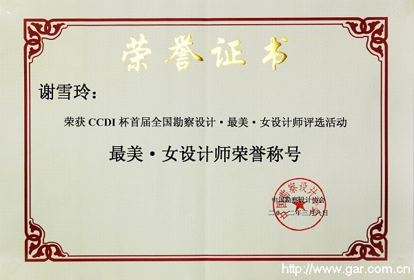 在第102個“三八”國際勞動婦女節來臨之際,由中國勘察設計協會主辦、中國勘察設計協會網站和《工程建設與設計》雜志共同承辦的“CCDI杯首屆全國勘察設計·最美·女設計師評選活動”于2012年3月8日圓滿結束。我院設計三所的優秀建筑專業設計師謝雪玲獲此榮譽。她是我院選送的5名參賽者中,唯一獲獎的選手。 本次活動自2月7日開始,歷經一個月的時間,共有全國25個省市自治區150家勘察設計單位推薦的449名候選人參加評選。通過網絡投票、評審委員會的評審,共評選出100名最美女設計師。