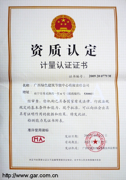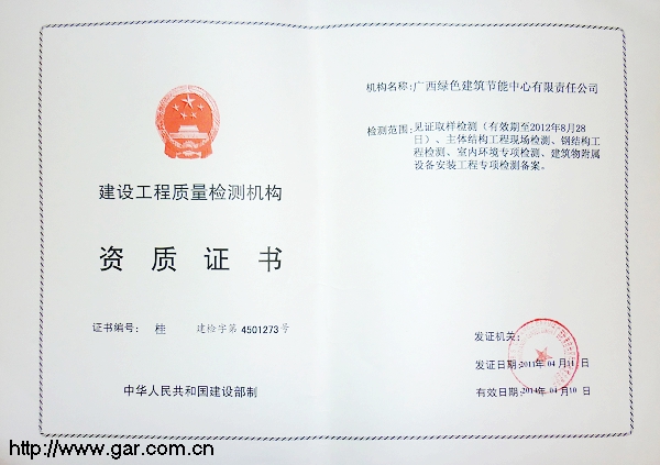 廣西綠色建筑節(jié)能中心有限責(zé)任公司于2009年6月22日獲自治區(qū)質(zhì)量技術(shù)監(jiān)督局頒發(fā)的計(jì)量認(rèn)證資質(zhì)認(rèn)定,并于2011年4月11日獲自治區(qū)住建廳頒發(fā)的建設(shè)工程質(zhì)量檢測(cè)機(jī)構(gòu)資質(zhì)。