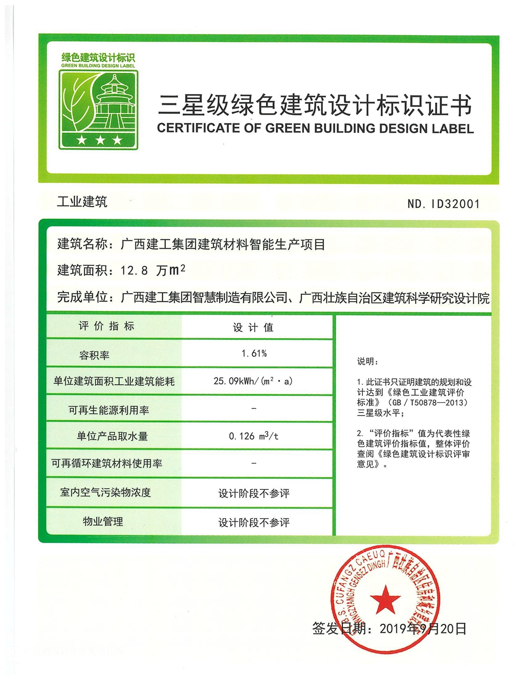 本項目于2019年6月申報綠色建筑設計標識,于2019年9月獲得三星級綠色建筑設計標識證書(工業建筑),成為廣西首個獲得三星級綠色工業建筑的項目。