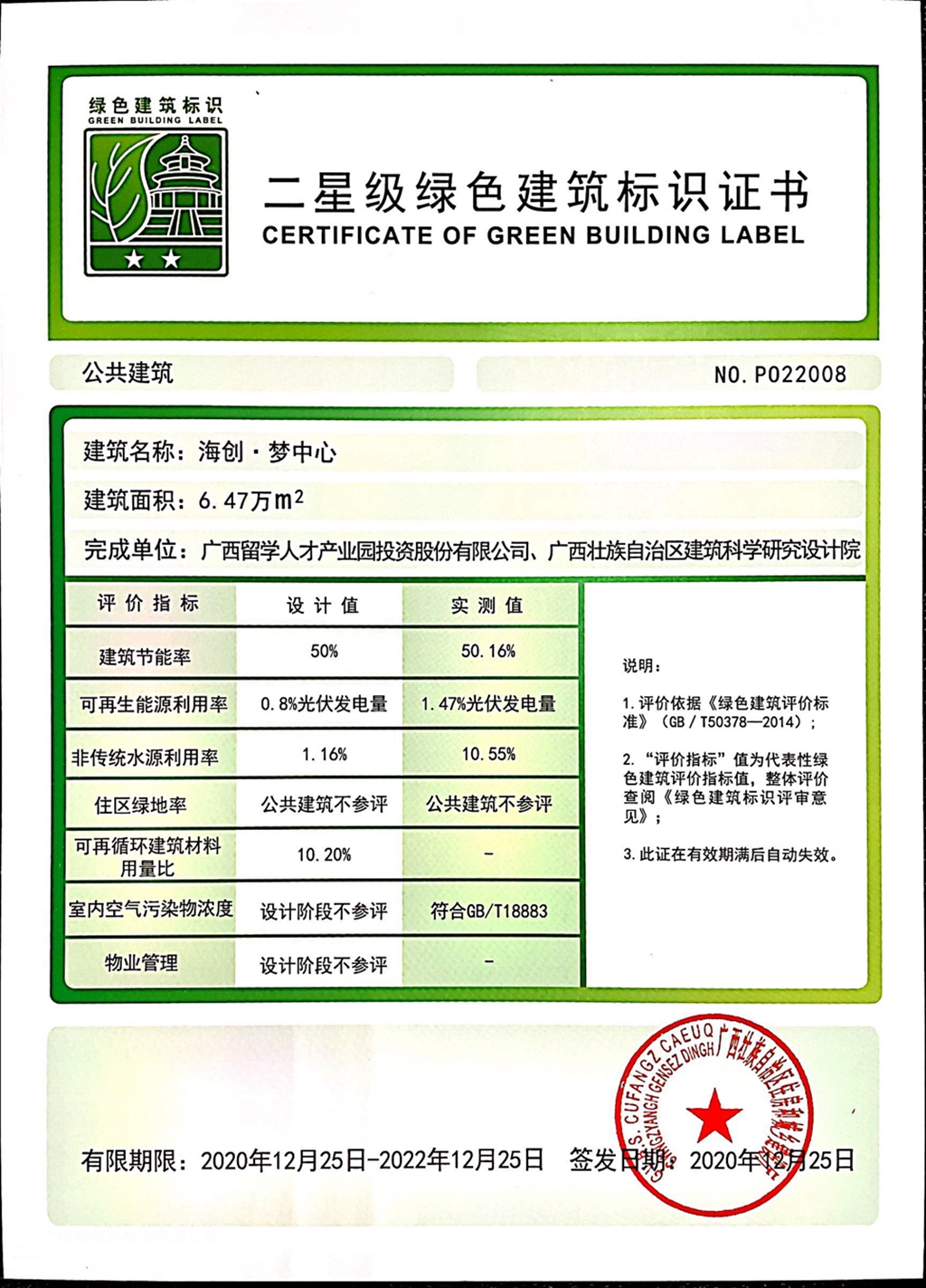 本項目于2020年7月申報綠色建筑運營標識,于2020年12月獲得二星級綠色建筑運營標識證書(民用建筑)。