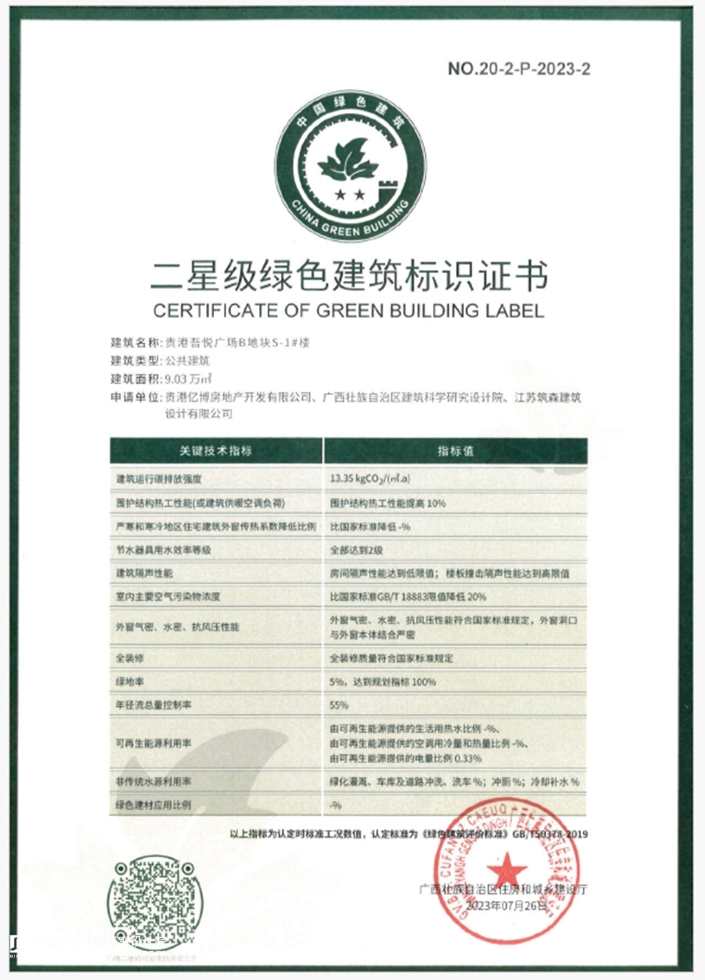 1、 貴港吾悅廣場B地塊S-1#樓 二星級綠色建筑標識