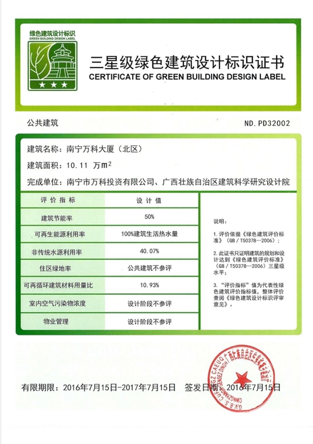 項目建筑面積約10萬平方米,獲得《綠色建筑評價標準》(GB/T50378-2006)三星級綠色建筑設計標識。