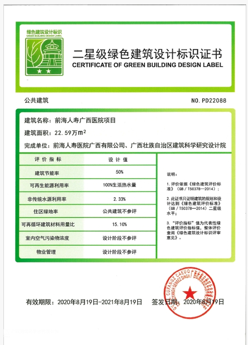 前海人壽廣西醫院項目,建筑面積22萬平方米,獲得二星級綠色建筑設計標識。